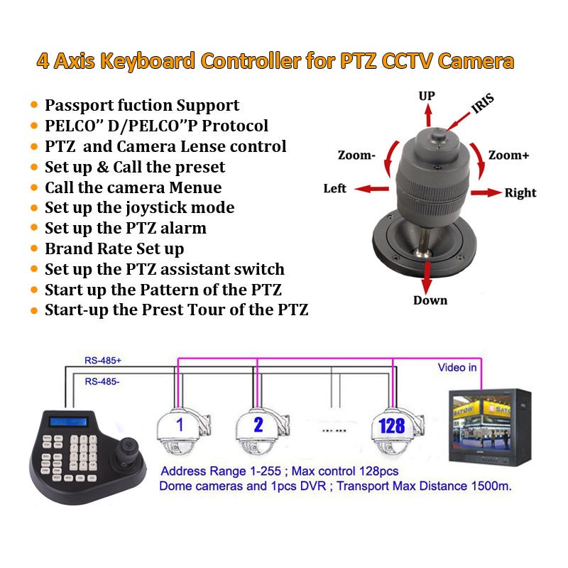 The controlling keyboard can be used to control matching terminal devices such as high constant-speed dome PTZ cameras, decoders, etc. It can control as many as 128 speed dome cameras or other terminals within a maximum conmmunication range of 1.5km (4900ft) via twisted-pair.