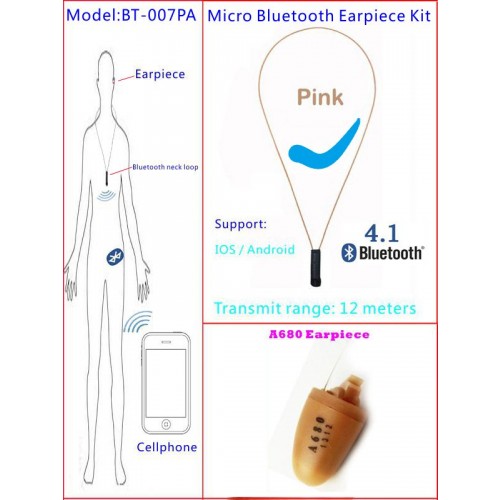 Pink necklace invisable micro bluetooth earpiece kit with A680 micro earpiece,bluetooth 4.1 neck loop bluetooth invisable earpiece